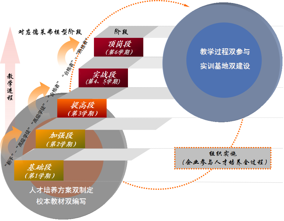 该模式在教学进程方面,制定了每个培养阶段的学习目标和考核标准,增强学生学习的目的性,确保阶段性培养目标的实现,并参照德莱弗斯模型的技能培养标准,将学生经过三年学习后的技能目标定位为:应达到“合格者”的水平。