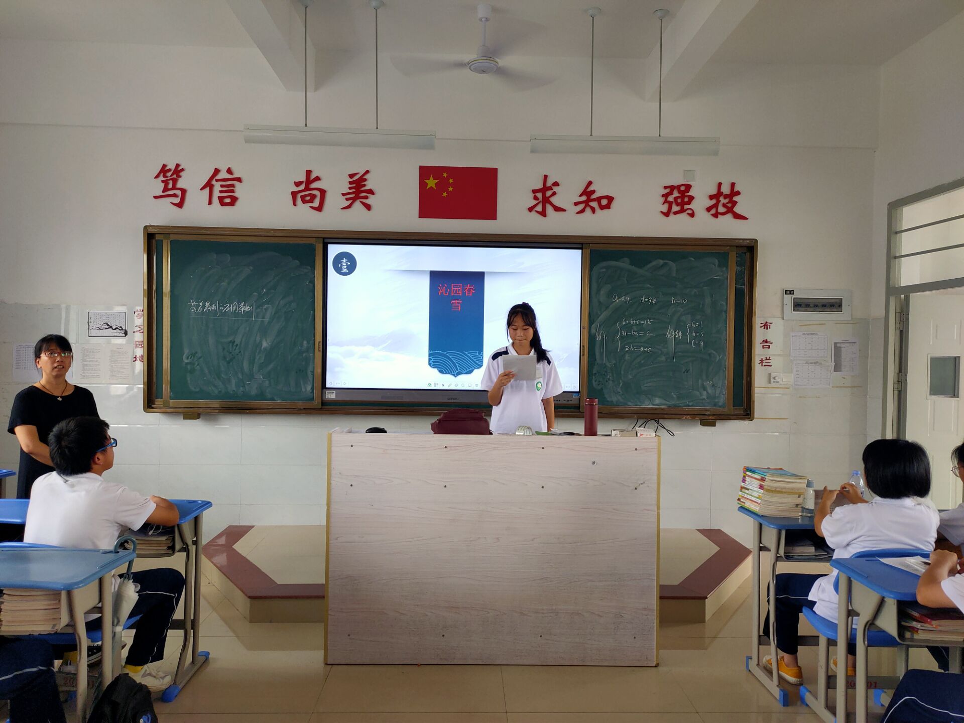 班长罗可欣同学首先上场,诵读了《沁园春·雪》,让我们感受到了北国雪景的纵横万里、大气磅礴、旷达豪迈的壮丽气势,体味到了毛主席对祖国大好河山的感慨万千。