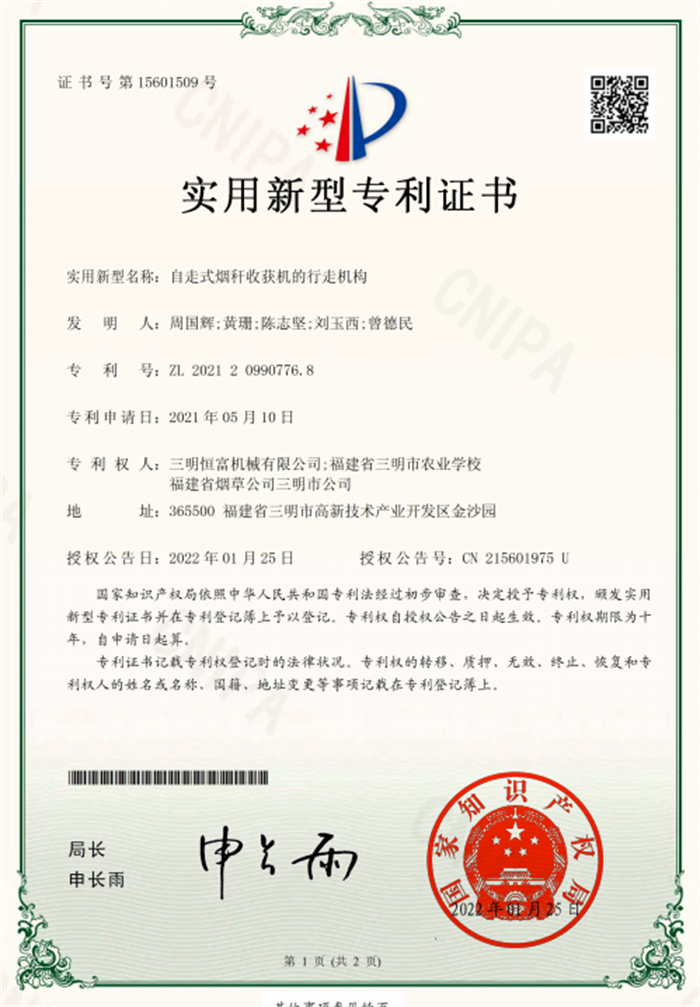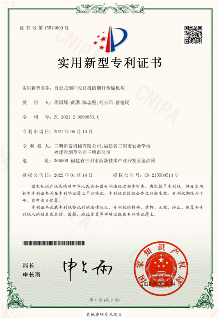 烟杆收获机项目于2022年新增的两项专利成果: