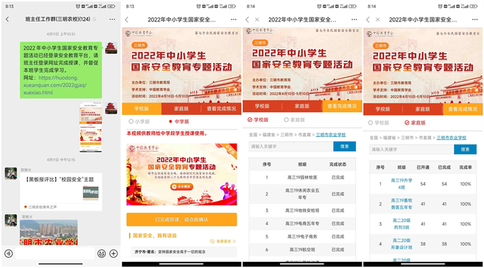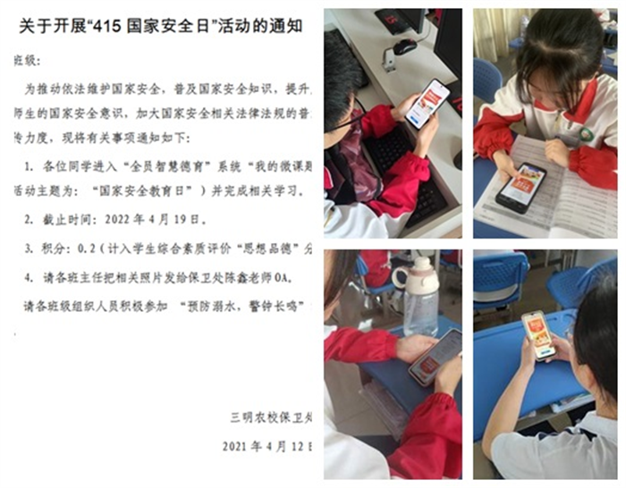 学校通过线上安全教育平台资源、三明农校全员智慧德育平台,以专题活动、微课题等方式,向全体师生讲解了全民国家安全教育日的由来,什么是总体国家安全观,与国家安全相关的法律,以及青少年如何维护国家安全等。