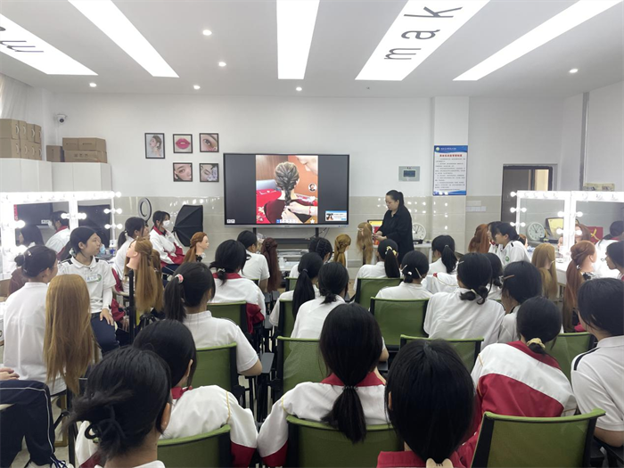 本次职业教育活动周的美发项目在美妆实训室开展,由美容美体艺术班的学生负责。他们借助假人头模为同学们展示了发型设计和修剪的原理、手法和注意事项,耐心地回答同学们的提问。在互动过程中,好奇的同学们跃跃欲试,个个都想动手尝试,在专业老师和美容美体艺术班同学的悉心指导下,大家完成了自己心仪的发型设计作品。