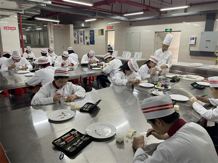 而在烹饪基地的另一头,冷拼雕刻的展示处也聚集起了围观人群。冷拼雕刻作为烹饪专业的特色项目,不仅考验学生对食材的选择,还考验学生的刀工和审美。在此次展示活动中,专业教师在一旁讲解冷拼雕刻的手法要点,并亲自上手示范,参加展示的学生在人群的围观下,手法娴熟地雕刻出栩栩如生作品,如展翅欲飞的鸟儿,灼灼盛放的花朵。围观人群不时发出惊叹。