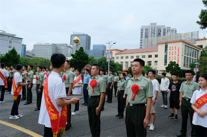 (三明农校学生为退役士兵佩戴红花)