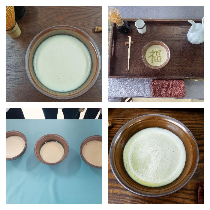 随后,同学们自由组队,按部就班,开始仿宋点茶体验活动。烫盏时,全神贯注、细致入微;调膏时,新奇与兴奋溢于言表;注汤时,沉稳耐心,不急不躁;击拂时,力求完美。几番摸索尝试,终于成功点出细腻茶汤,引得阵阵欢呼。